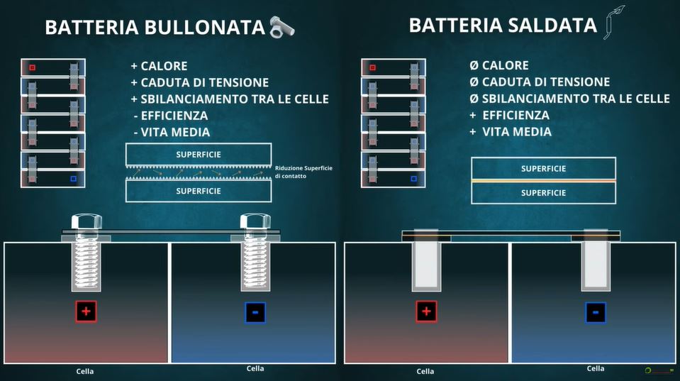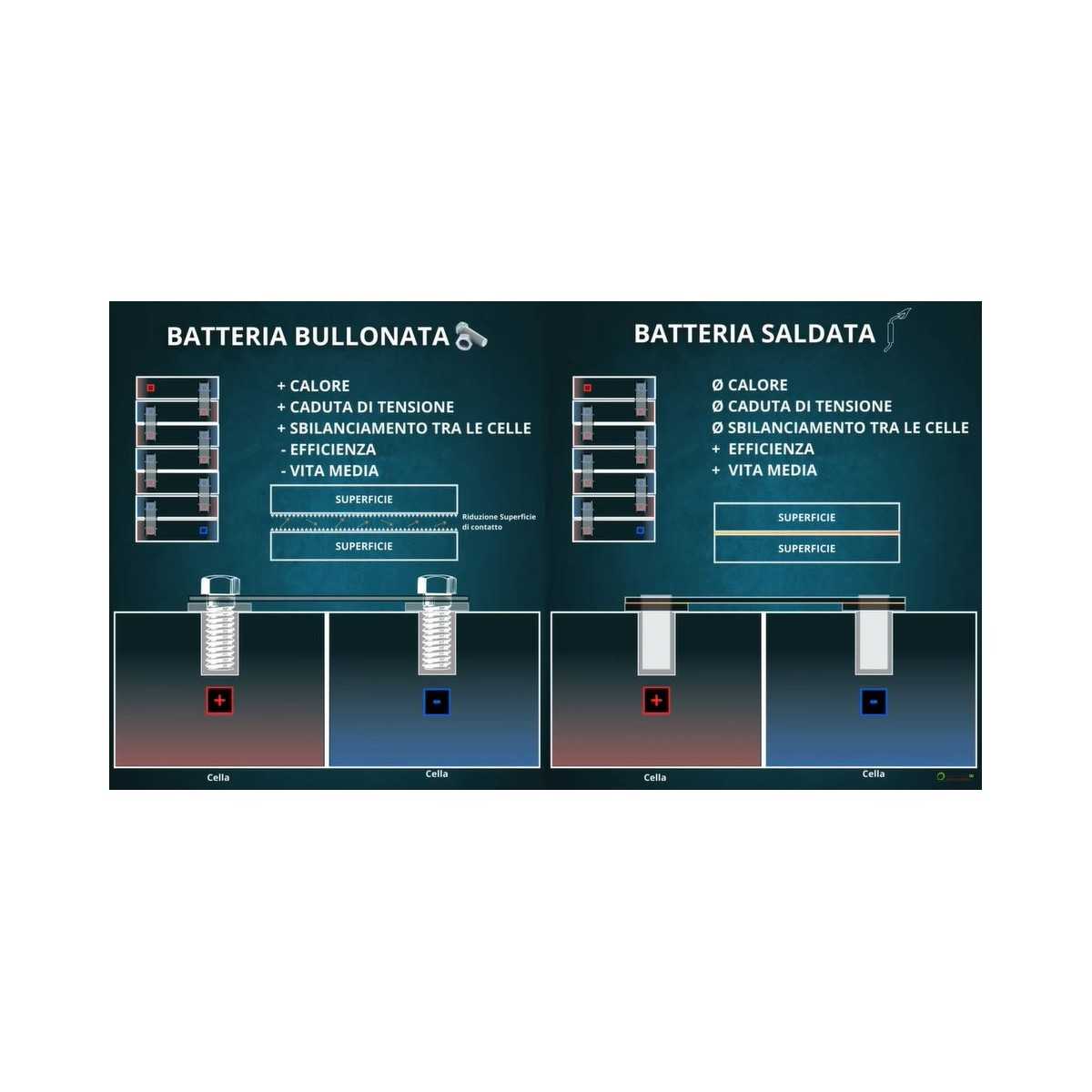 Un'altra caratteristica molto importante di questa batteria è che ha le celle saldate e non bullonate: questo garantisce una connessione ad altissimo livello, 0 perdite di carico e 0 sbilanciamento da forti correnti di carica e scarica. Tutti questi vantaggi sono l'ultimo modo per garantire longevità alla batteria.