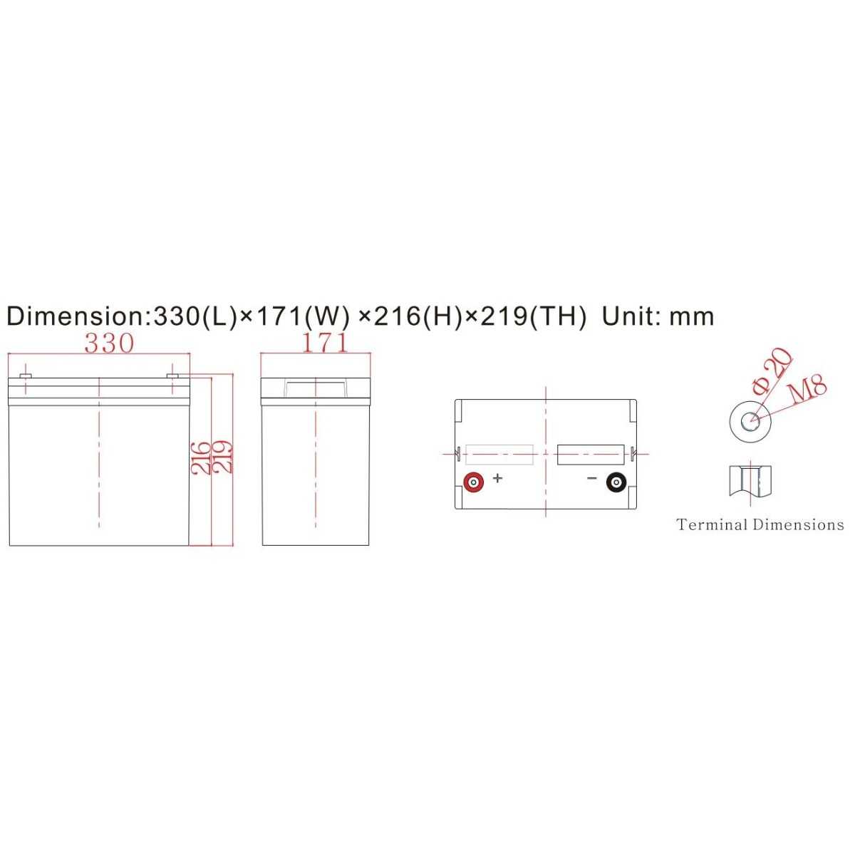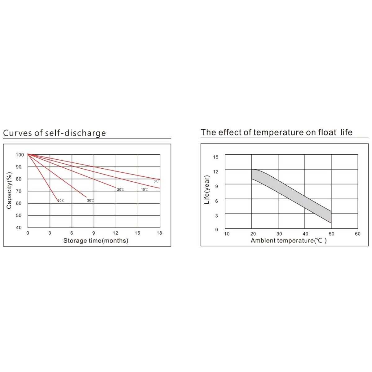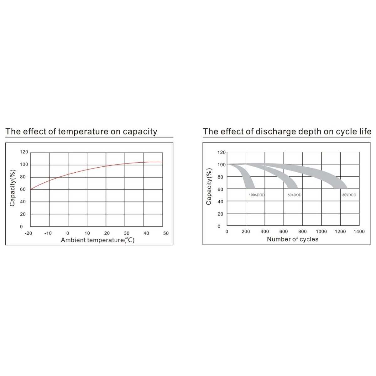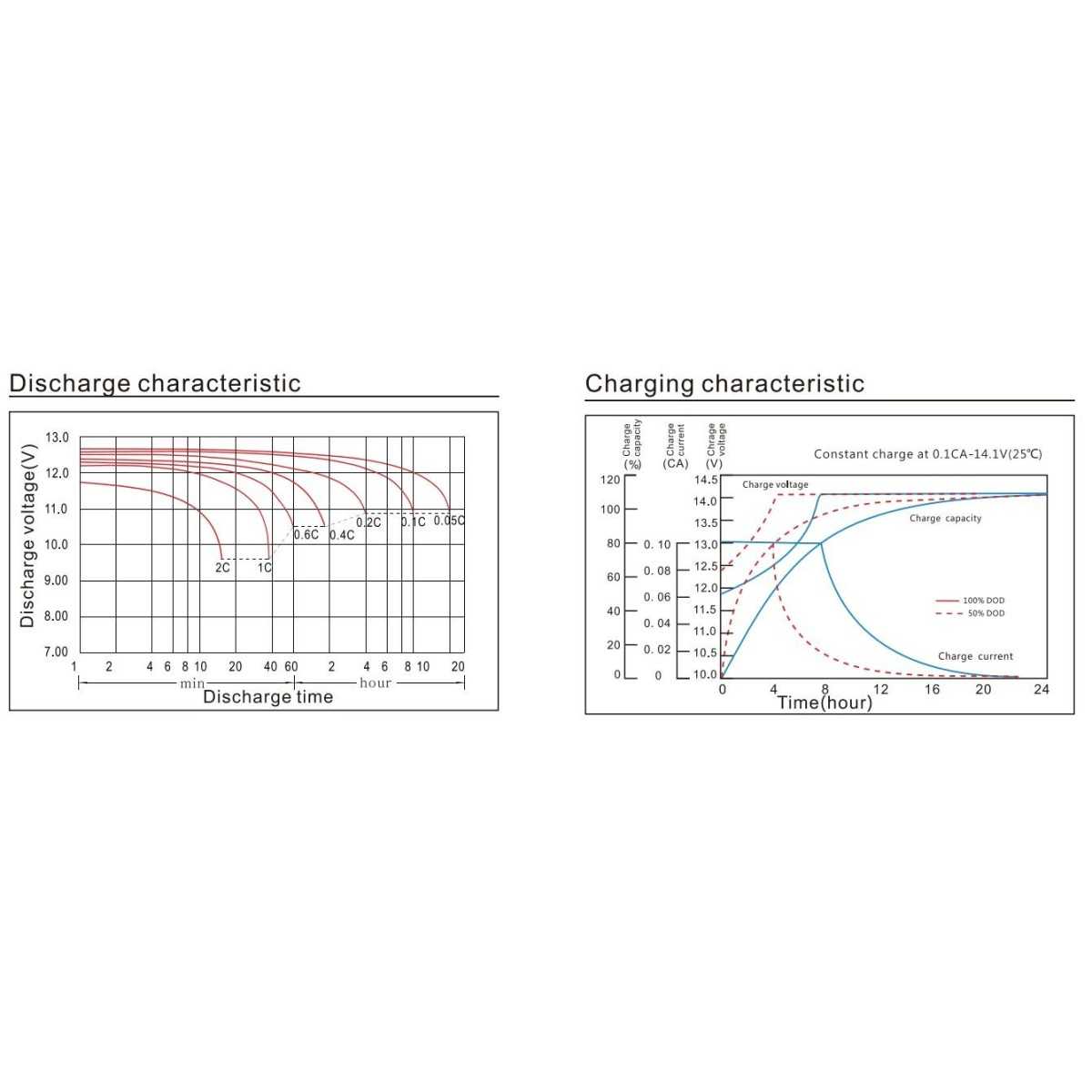 Metodo di carica | Corrente di carica: Max 25A, Raccom. 10A Carica di equalizzazione: 13.8-14.1V, raccom.14.1V (-24mV/C) Carica ciclica: 14.4-15V, raccom.14.7V (-30mV/C) |