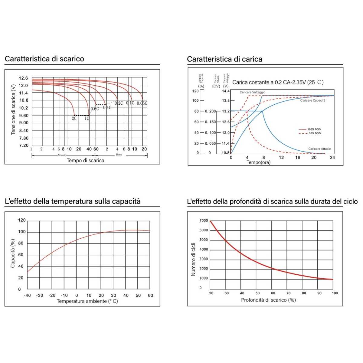Metodo di carica | Corrente di carica: Max 60A, Raccom. 20.0~40.0A Carica di equalizzazione: 13.8-14.1V, raccom.14.1V (-24mV/°C) Carica ciclica: 14.4-15V, raccom.14.8V (-30mV/°C) |
