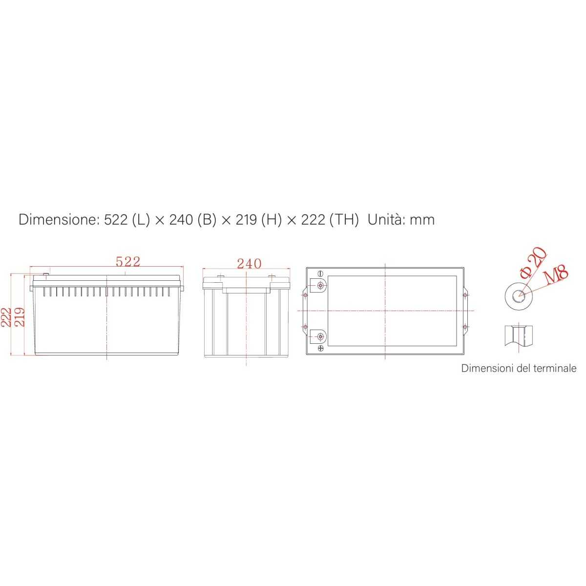 Piombo-Carbone Deep Cycle - senza manutenzione - dura più a lungo - 200Ah 12V - Dim: 52,20 x 24 x 22,20h cm - Peso Kg 61,50