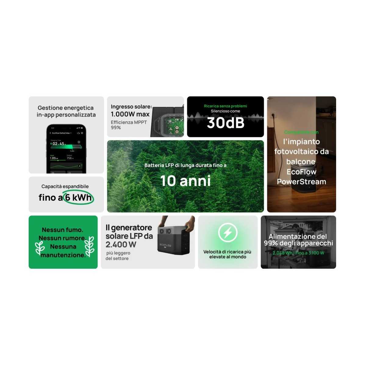 Con una capacità di base di 2048Wh, espandibile fino a 6144Wh grazie alle batterie aggiuntive EcoFlow, la DELTA 2 Max è la power station perfetta per vivere in off-grid senza rinunce.
