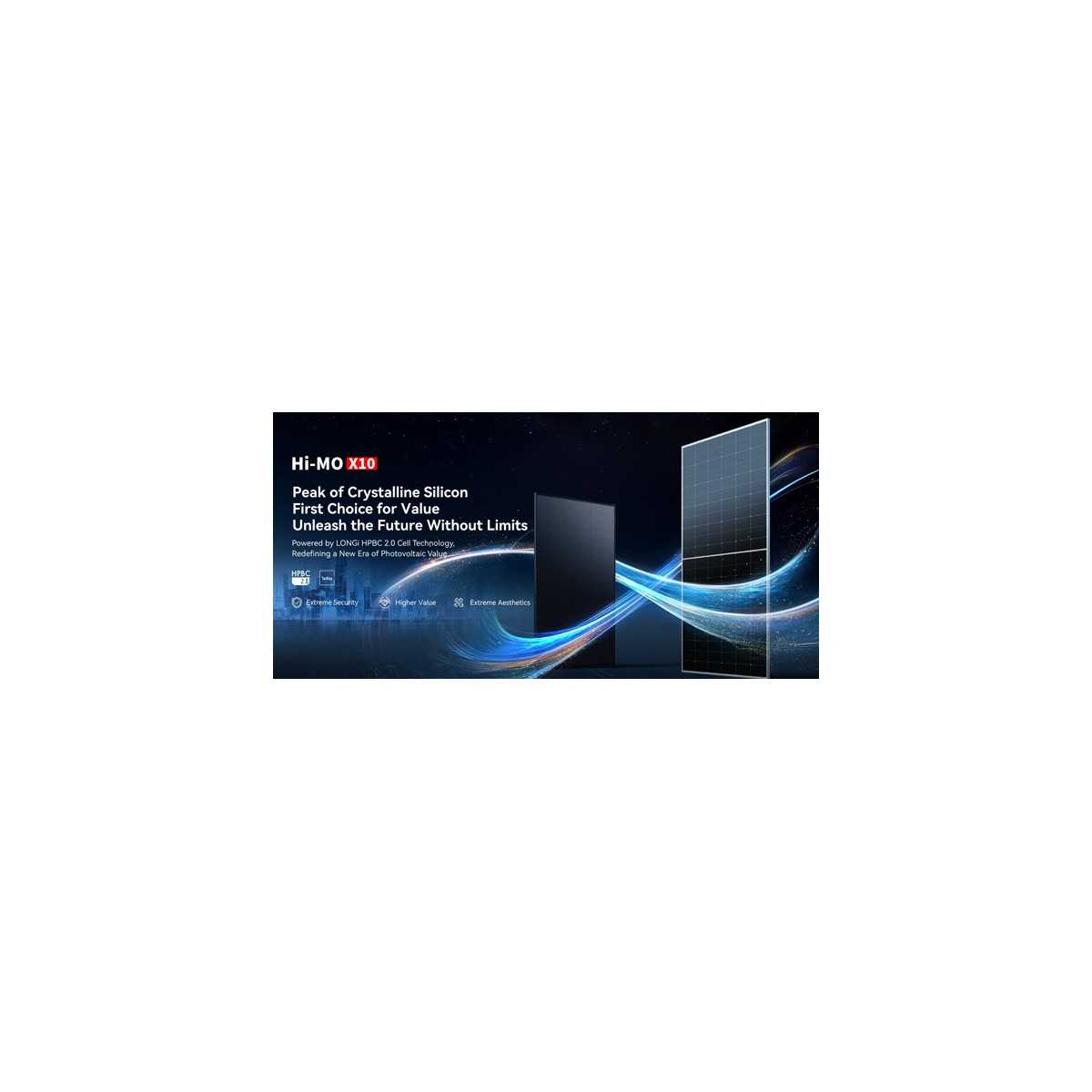 Il pannello fotovoltaico Longi Hi-Mo X10 da 485W unisce design elegante full black e tecnologia HPBC 2.0 per offrire un’efficienza eccezionale fino al 23%. Grazie all’assenza di griglie anteriori e alle celle half-cut, garantisce maggiore produzione in meno spazio, ottime prestazioni anche in ombra parziale e una resa costante nel tempo.