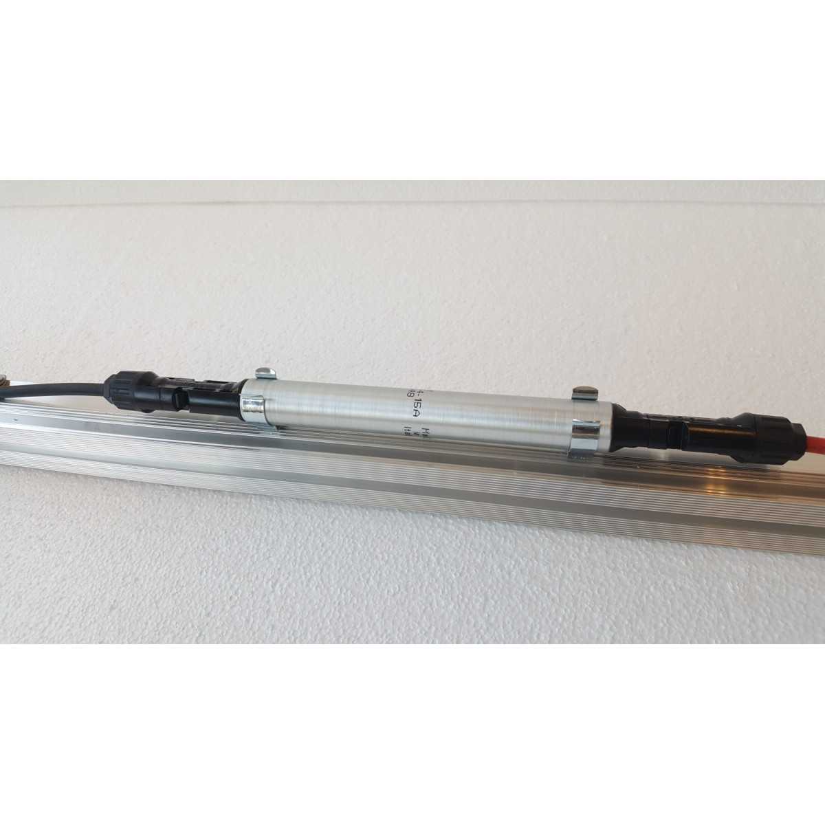Diodo di blocco da 15A integrato in un robusto case di alluminio anodizzato con funzione di dissipatore, e connettori tipo MC4 per un pratico collegamento, fornito con clip di fissaggio.