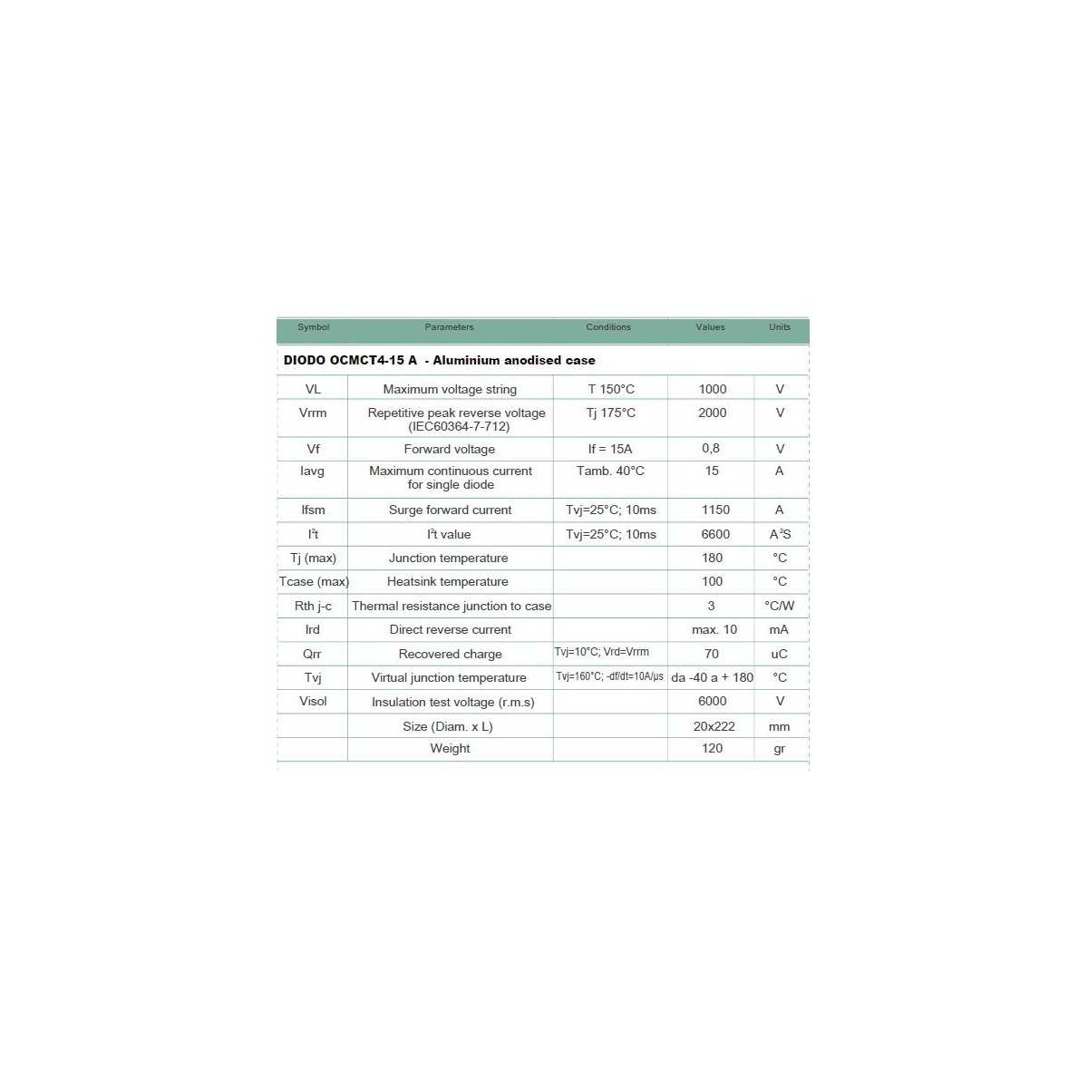 - Picco tensione inversa (IEC60364-7-712) a 175°C: 2000V