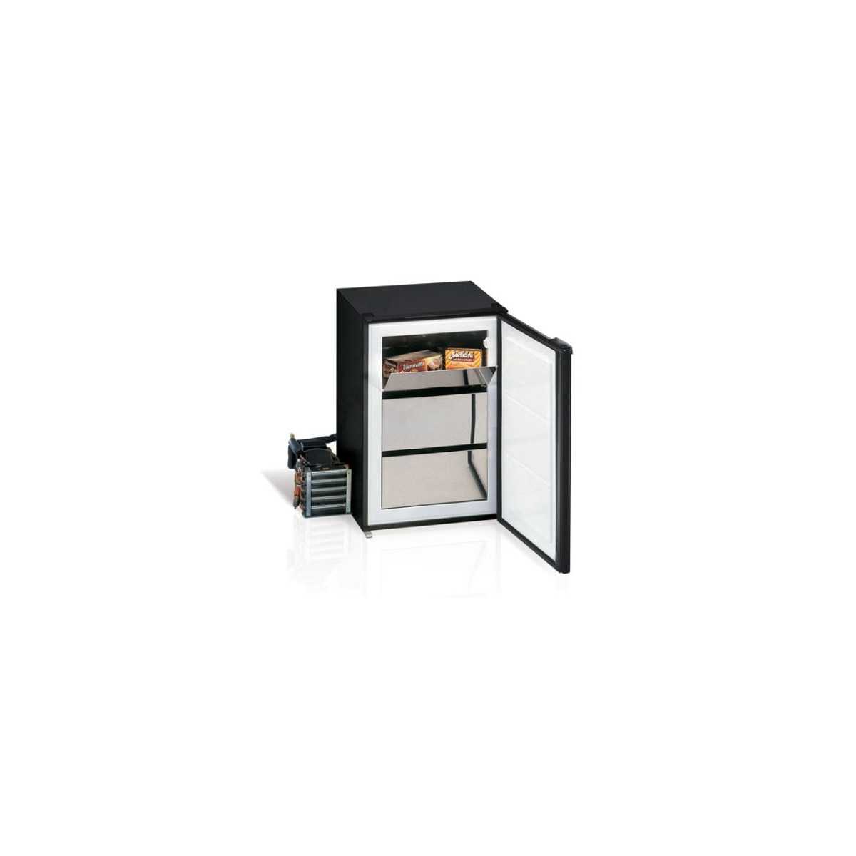 Congelatore 110 litri, alimentato in corrente continua a 12/24V, a basso consumo, ideale abbinamento a kit fotovoltaici per baite isolate, camper, imbarcazioni e in generale per risparmio energetico. Completo di gruppo refrigerante interno.