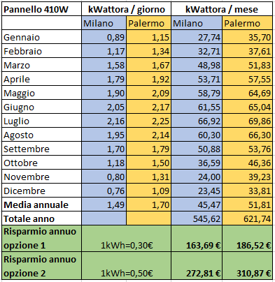 Ipotizzando un'esposizione a Sud, con inclinazione 30°, senza ombreggiature durante il giorno, possiamo stimare la seguente produzione: