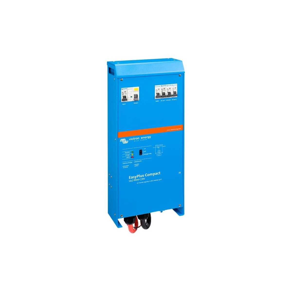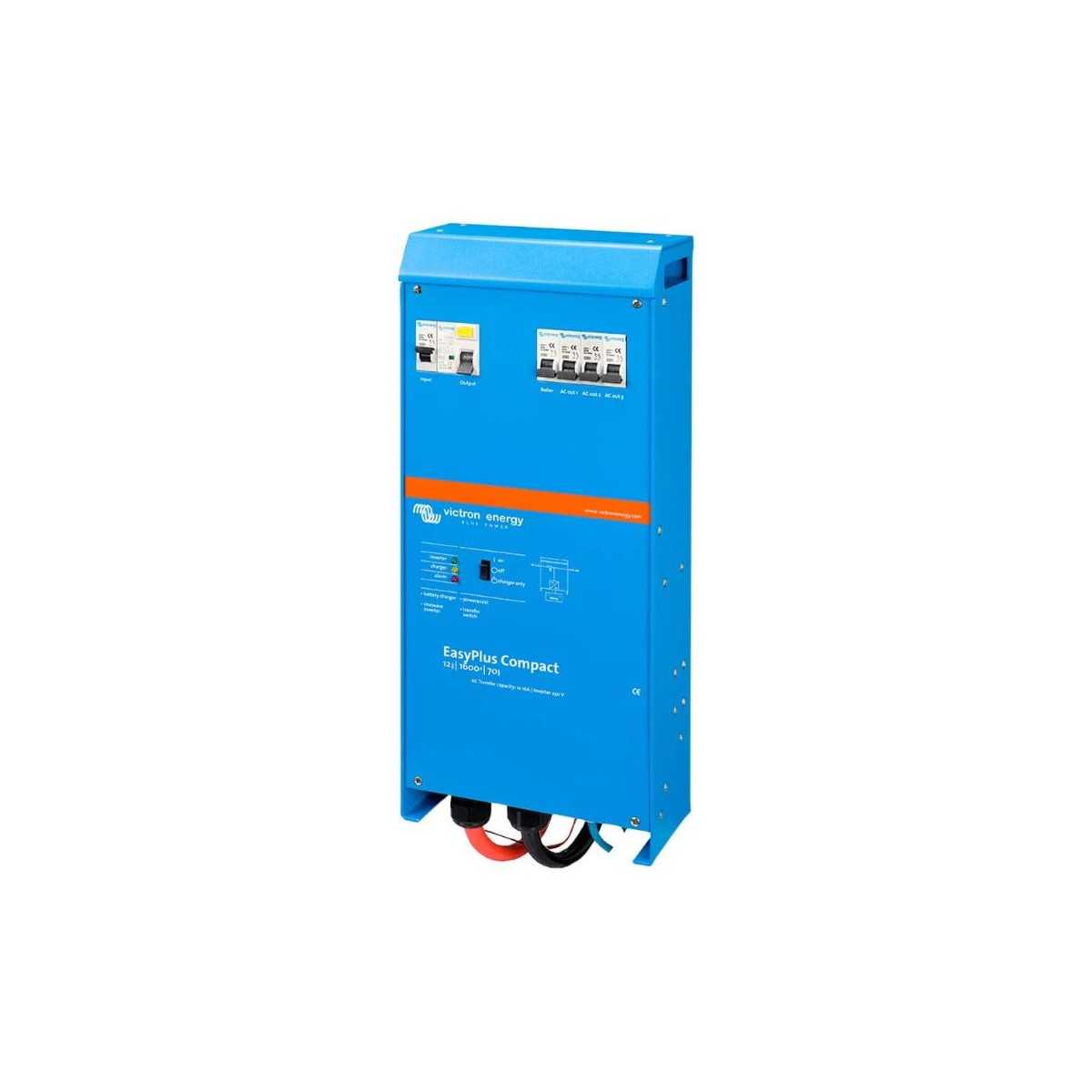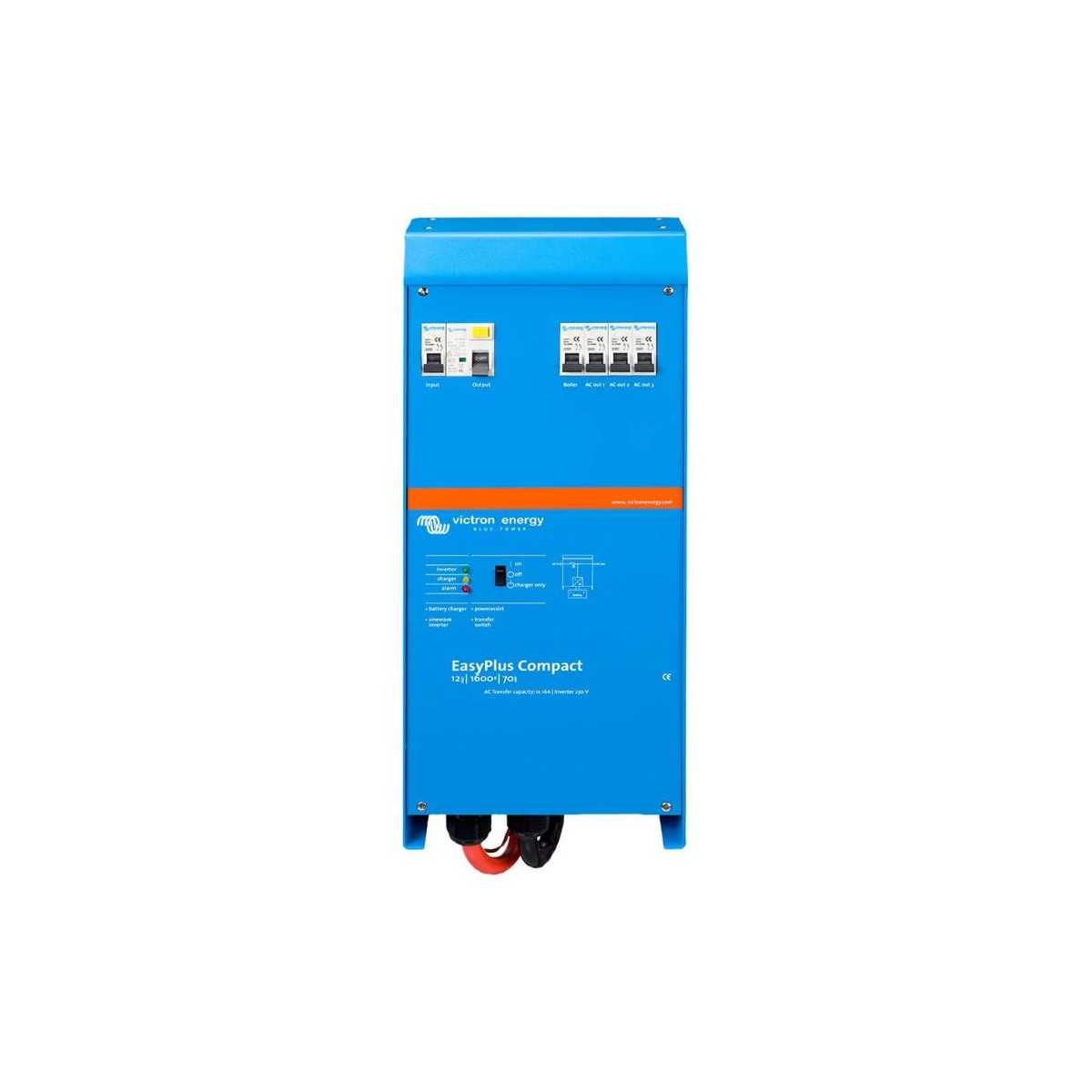 Sistema combinato Victron EasyPlus 12V 1600VA: inverter a onda pura, caricabatterie da 70A e commutatore automatico in un unico dispositivo compatto, ideale per camper, barche e installazioni mobili.