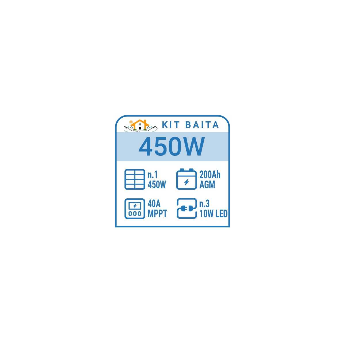 Include pannello fotovoltaico 450W, regolatore MPPT 40A con display 2 USB, batteria ermetica 200Ah e 3 lampadine led 10W (equivalenti a 90W tradizionali)