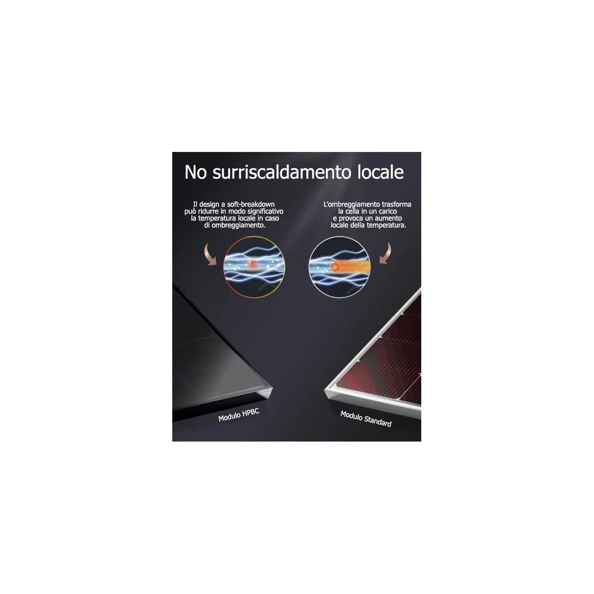 • Tecnologia HPBC (Hybrid Passivated Back Contact) con contatti completamente sul retro: niente griglie metalliche frontali, solo superficie attiva esposta alla luce.