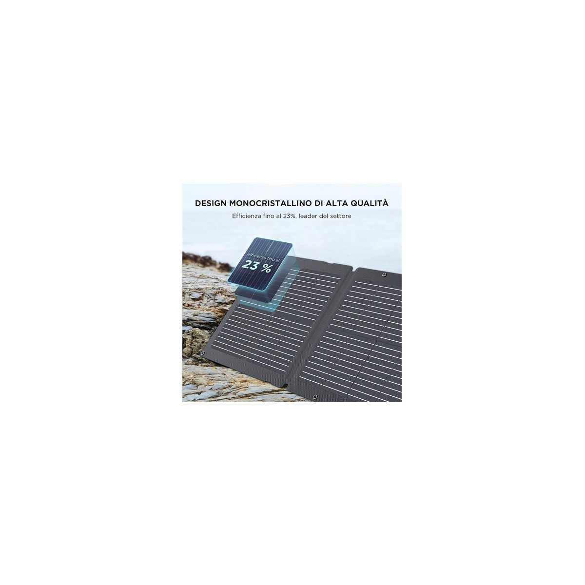 Porta l'energia solare ovunque! Con un tasso di conversione del 23% (leader del settore), è molto più leggero e ca. 10% più piccolo dei pannelli solari portatili simili sul mercato. Ciò significa una ricarica più rapida e semplice ovunque tu sia.