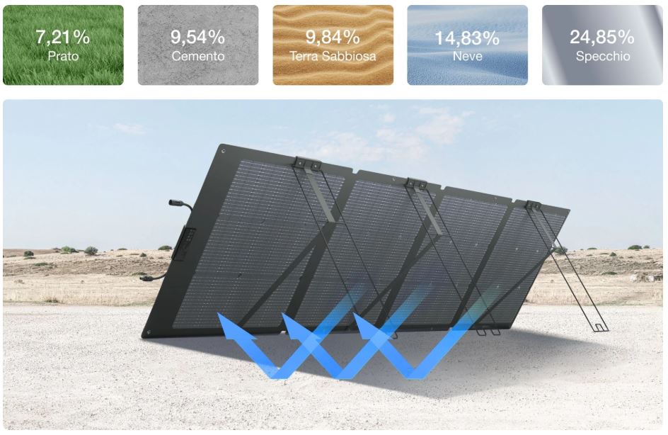 Il pannello solare portatile bifacciale da 220 W di EcoFlow è due in uno. Con un lato primario da 220 W e un lato da 175 W sul retro per la luce ambientale, puoi catturare fino al 28% in più di energia solare e caricare la tua centrale elettrica portatile ancora più velocemente. Prova una superficie a specchio e puoi ottenere fino all'80% di energia in più.