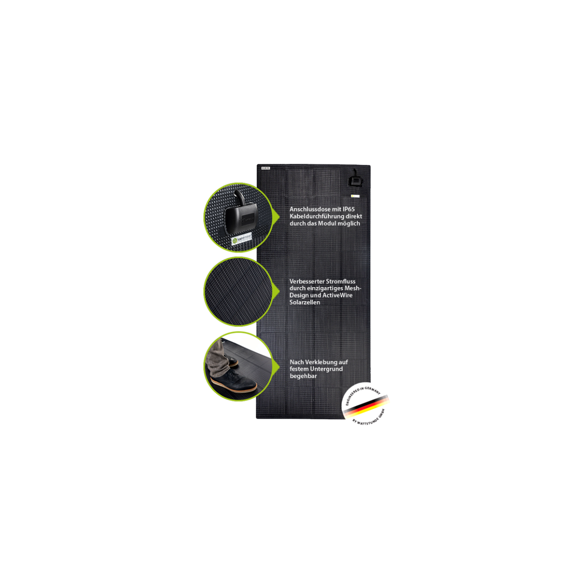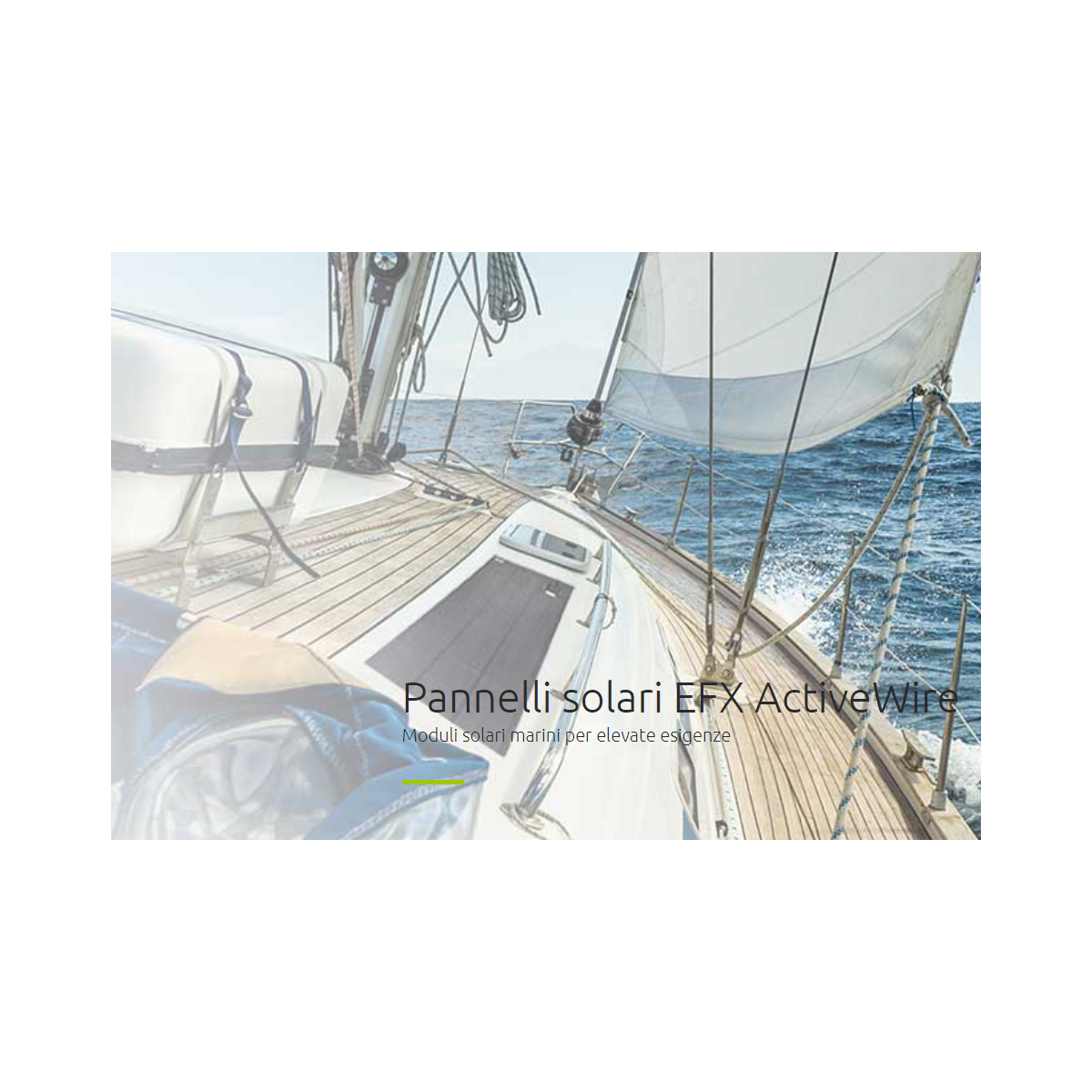 I nuovi e innovativi moduli solari della serie EFX Active Wire sono prodotti secondo rigorose linee guida di qualità e testati e certificati secondo le direttive ISO. I moduli semiflessibili sono costruiti con le potenti celle solari Active Wire, che hanno un'efficienza superiore al 20%. I campi di applicazione ideali sono camper, furgoni (soprattutto VW California o simili), caravan e imbarcazioni.