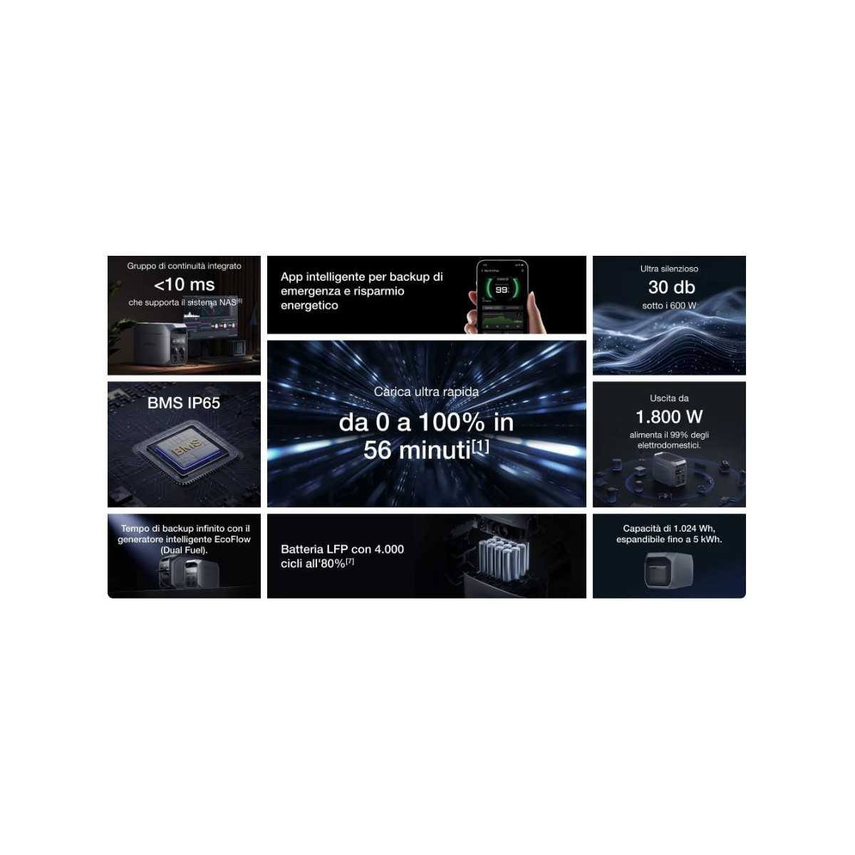 • App EcoFlow (iOS e Android): monitoraggio e gestione da remoto via Bluetooth o WiFi
