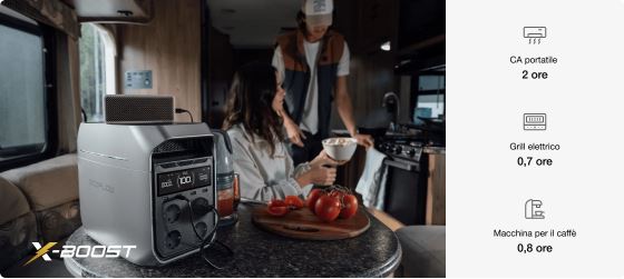 I dispositivi EcoFlow supportano la ricarica simultanea da rete, pannelli solari e altre fonti (“MultiCharge”), ottenendo tempi di ricarica molto rapidi.