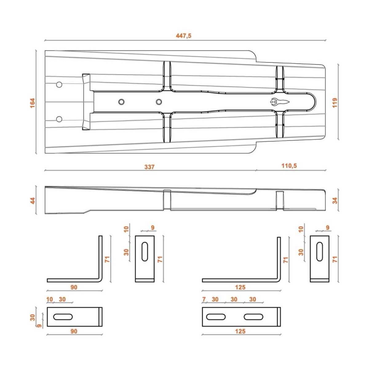 Il kit comprende: - n. 2 barre in alluminio di profilo portante con canalina per cavi - n. 4 morsetti iniziale/finale anodizzati col. grigio - n. 2 morsetti intermedi anodizzati col. grigio - n. 4 staffe regolabili acciaio inox ad incollaggio specifiche per coppo